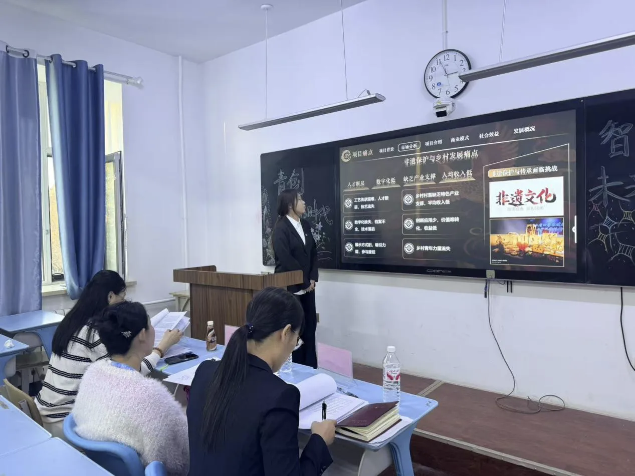 在比赛正式开始之前,活动负责人详细介绍了赛事筹备理历程、评分标准及奖项设置,强调本次比赛旨在搭建教育专业与创新创业融合的实践平台。比赛分为讲解ppt、评委老师提问两个环节。在参赛同学的演讲中,“跨境赋能·非遗新生”、“步韵·智芯”等小组围绕“科技创新和未来产业”“乡村振兴和农业农村现代化”等前沿选题,通过生动的案例分析,专业的项目数据,清晰的逻辑架构展示团队的项目成果。