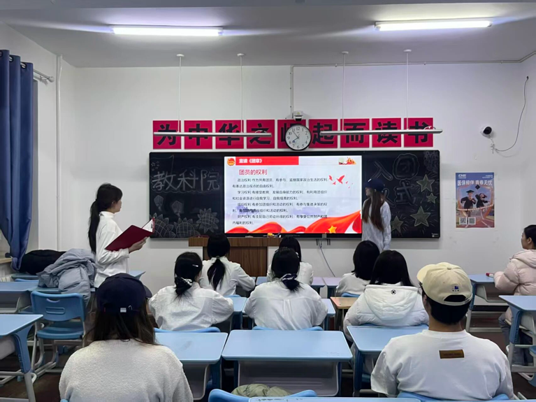 庄严宣誓 宣读入团名单。仪式现场,新团员身着统一服装,面向团旗列队肃立。在领誓人的带领下,青年们高擎右拳,以洪亮的声音庄严宣誓:“我志愿加入中国共产主义青年团……”誓词回荡教室,既承载着青年对组织的信仰承诺,也彰显着新一代对家国的赤诚热爱。宣誓结束后,主持人宣读新团员名单,宋新月、宋乡育等8名同学正式成为共青团组织的新成员。