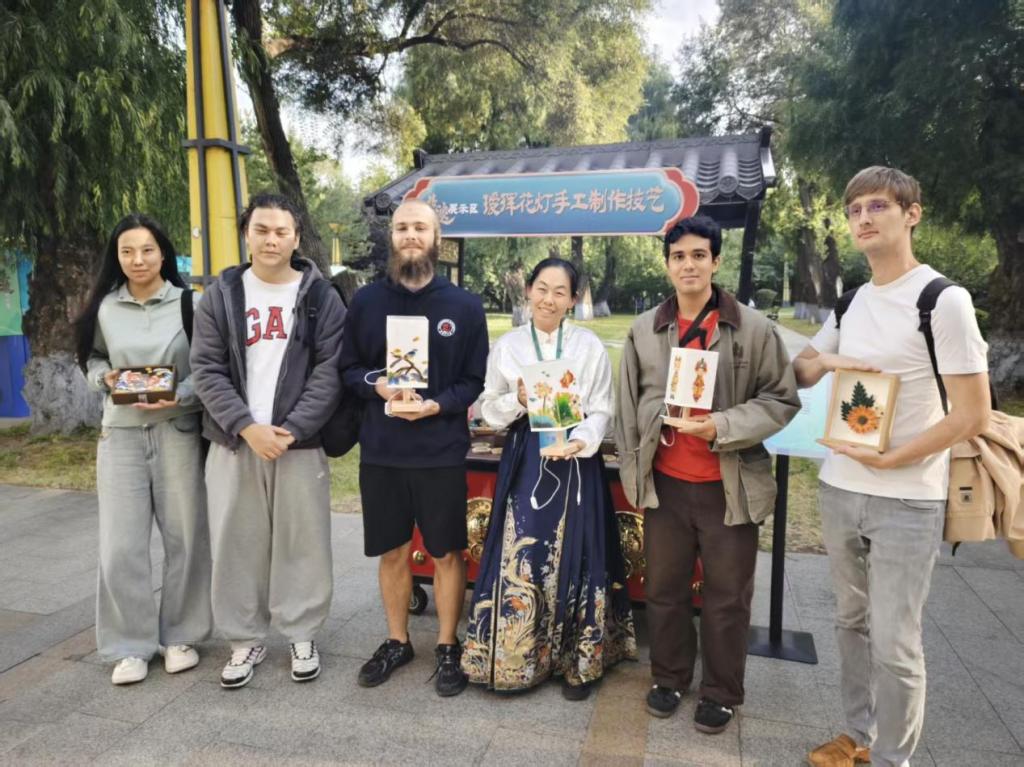 曹馨月在非遗展示区现场演示了瑷珲花灯的制作工艺,吸引了大量师生和中外游客的驻足观看和互动体验。她通过精湛的技艺展示和深入浅出的讲解,使观众不仅了解到瑷珲花灯的历史渊源与文化象征,也感受到黑河地区传统手工艺的深厚底蕴与艺术价值。