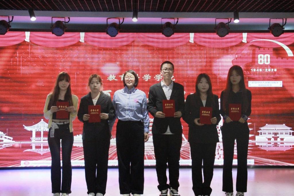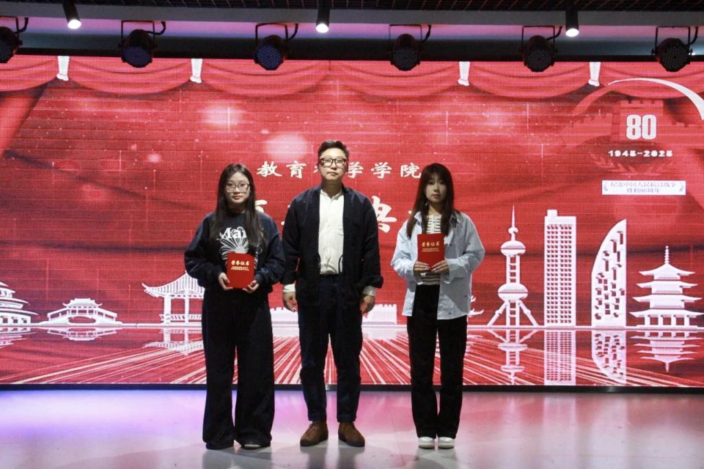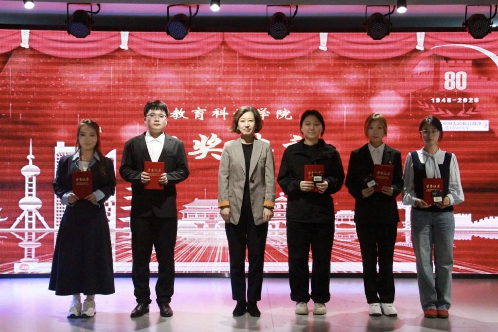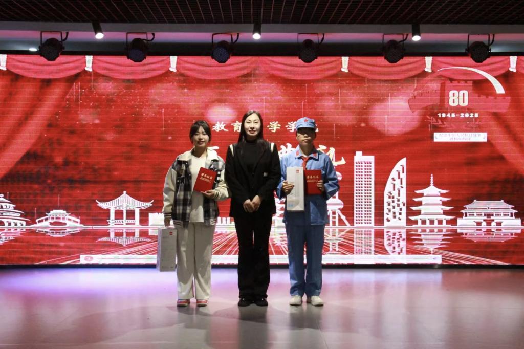 荣誉为证,助力弘扬红色文化。本次活动评出一等奖2名、二等奖4名、三等奖4名、优秀奖5名。在热烈的掌声中,教育科学学院领导上台为本次活动中获奖的选手依次颁发奖章。颁发的每一份奖项,不仅是对获奖选手个人能力与优异表现的高度肯定,更是对红色基因代代相传、红色文化持续弘扬的深情寄望与有力推动。